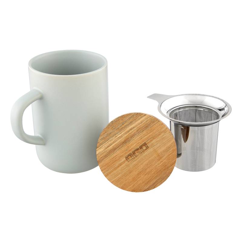 Teebecher Juliet eisblau mit Deckel und Sieb Teebecher mit besonderen Extras: einem Akazienholzdeckel, damit der Tee länger heiß bleibt und einem Sieb, der es ermöglicht, dass loser Tee direkt im Becher aufgebrüht werden kann.