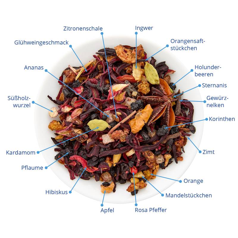 Hibiskus, Holunderbeeren, Apfelstückchen, Aromen, Korinthen (Korinthen, Sonnenblumenöl), Orangenstückchen, Pflaumenstückchen (Pflaume, Reismehl), Ananasstückchen (Ananas, Zucker, Säuerungsmittel: Citronensäure), Zimtstückchen, Gewürznelken, Sternanis, Kardamom, Mandelstückchen, Orangensaftstückchen, rosa Pfefferkörner, Ingwerstückchen, Süßholzwurzel, Zitronenschale.