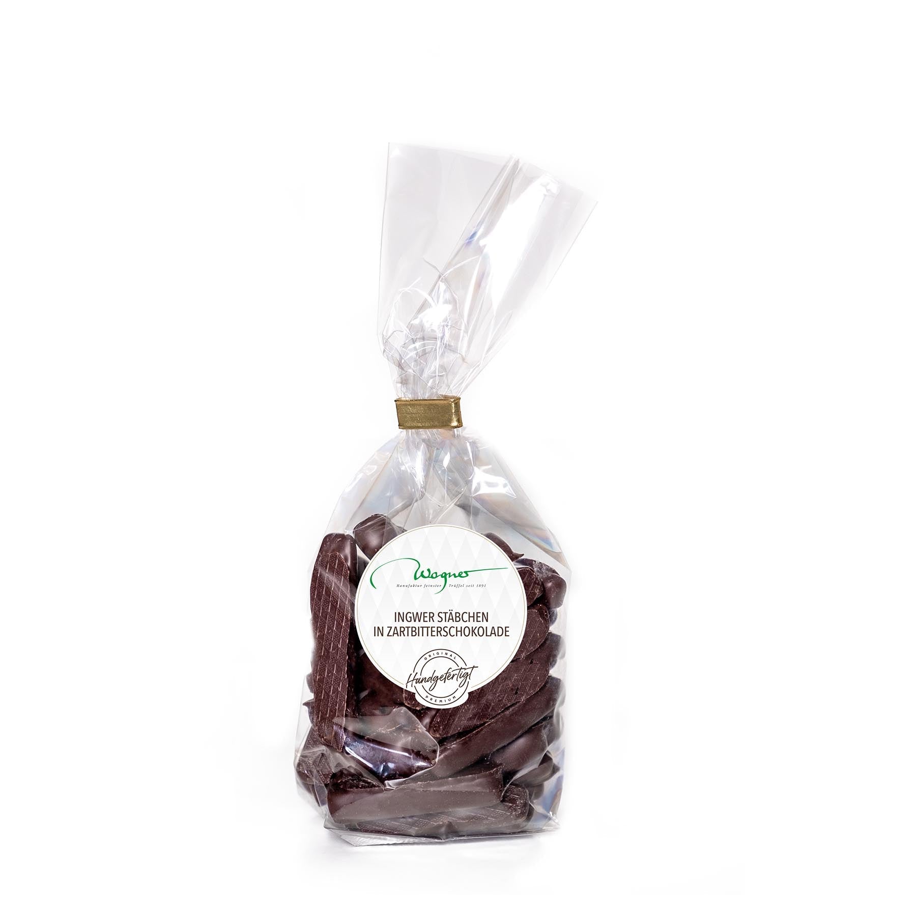 Zutaten*: Kandierter Ingwer (60%), Zartbitterschokolade (40%) (Zucker, Kakaomasse, Kakaobutter, Emulgator: Lecithine (SOJA); natürliches Vanillearoma).