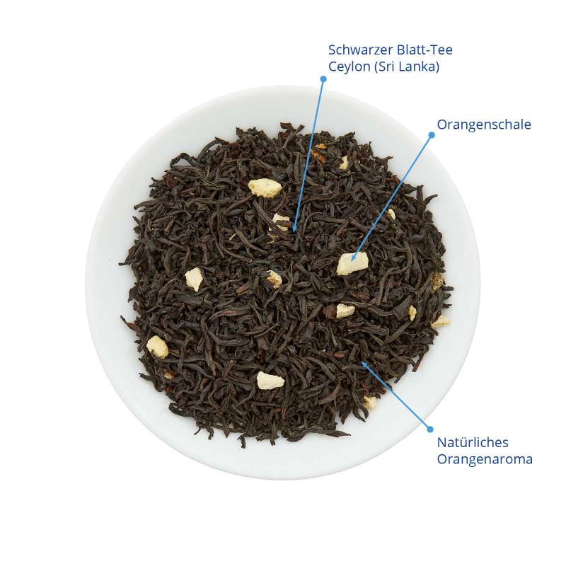 Schwarzer Tee (Ceylon), Orangenschale (5 %), natürliches Orangenaroma.